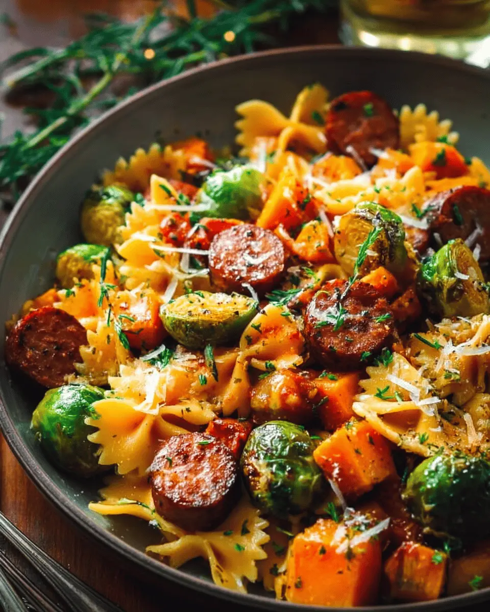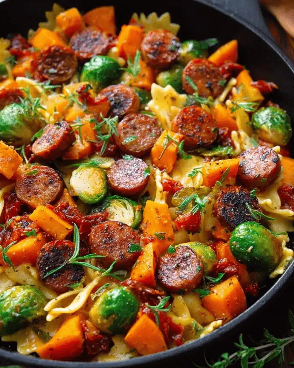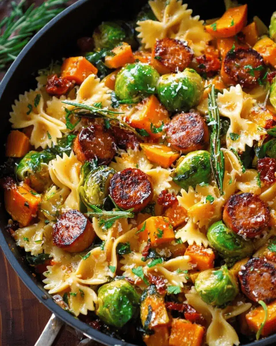Autumn Dinner with Sausage, Pasta, Brussels Sprouts and Butternut Squash