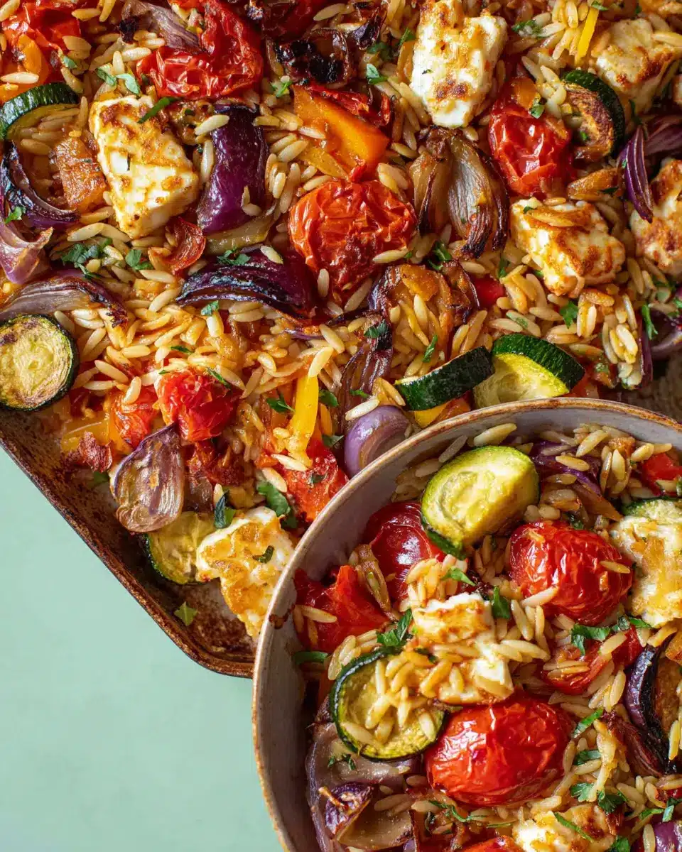 Baked Orzo Roasted Mediterranean Vegetables with Halloumi