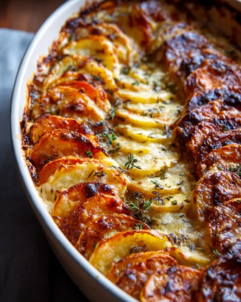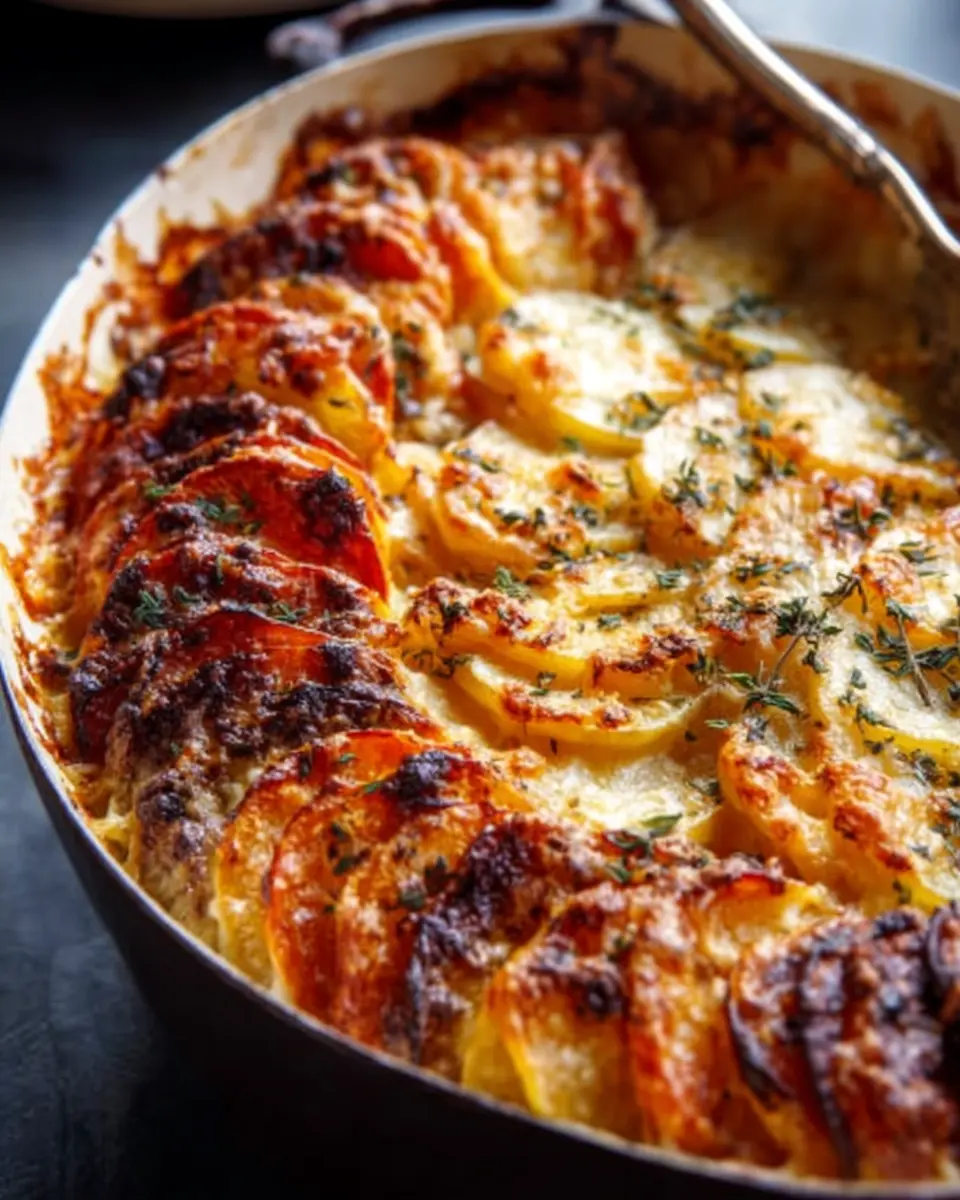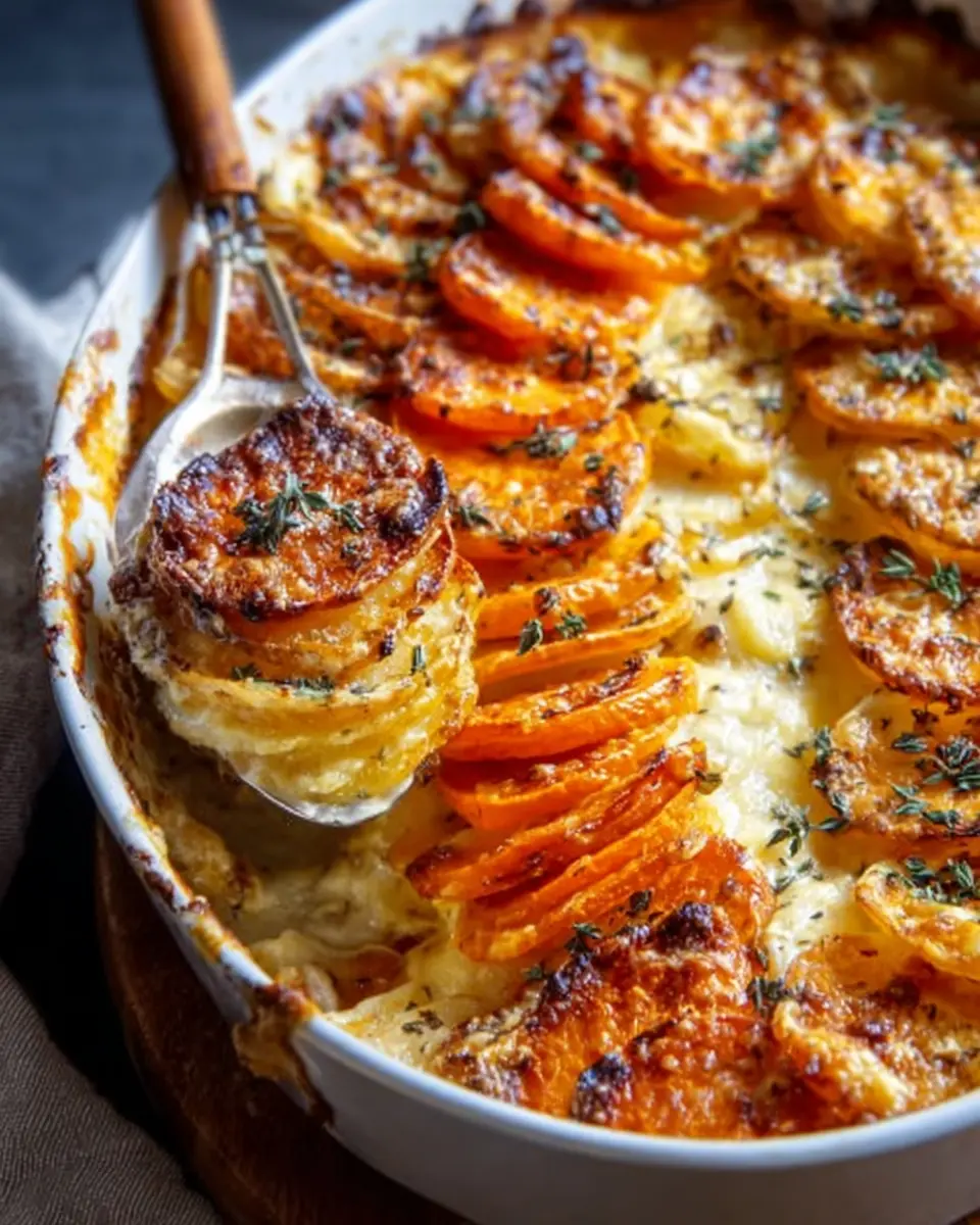 The cheesy root vegetable gratin is more than just a side dish; it's an experience! Creamy layers of sweet potatoes, parsnips, and beets come together beautifully, inviting everyone to the table. Perfect for cozy dinners or special occasions, it’s a dish that promises comfort and satisfaction. Dive in tonight!