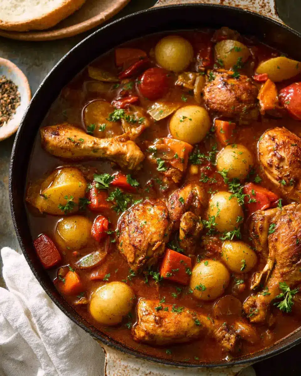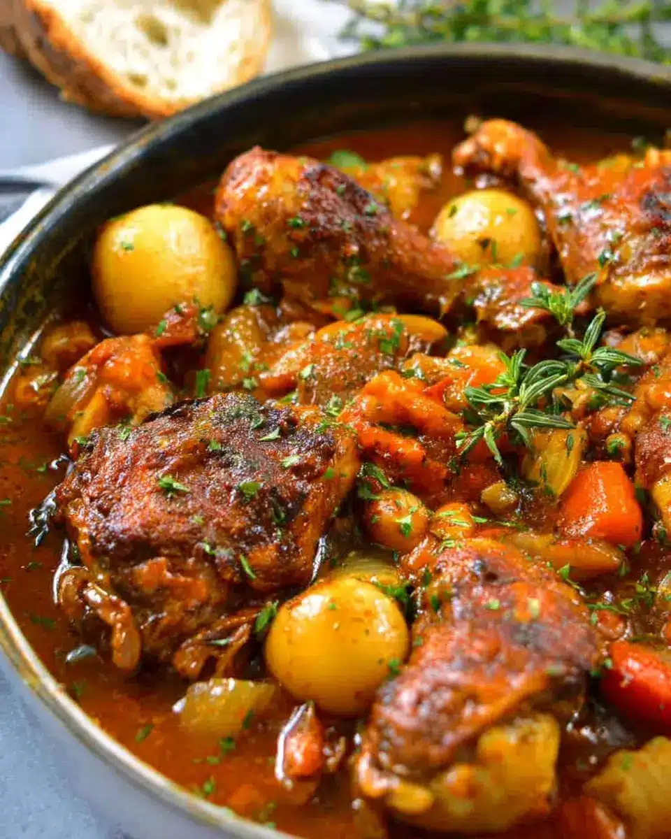 Once the cooking time is up, taste the sauce and adjust the seasoning if necessary. Serve your chicken stew warm, garnished with fresh thyme or parsley. It pairs perfectly with crusty bread for dunking, making every bite a cozy delight.