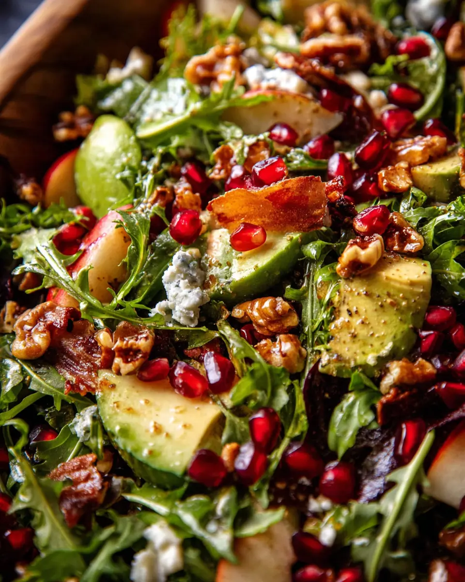 - Add the greens to a large salad bowl. Add the apple, avocados, and pomegranate. Sprinkle on the cheese and nuts. Gently toss the salad.
