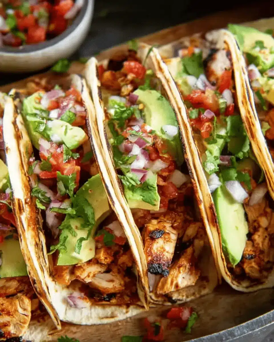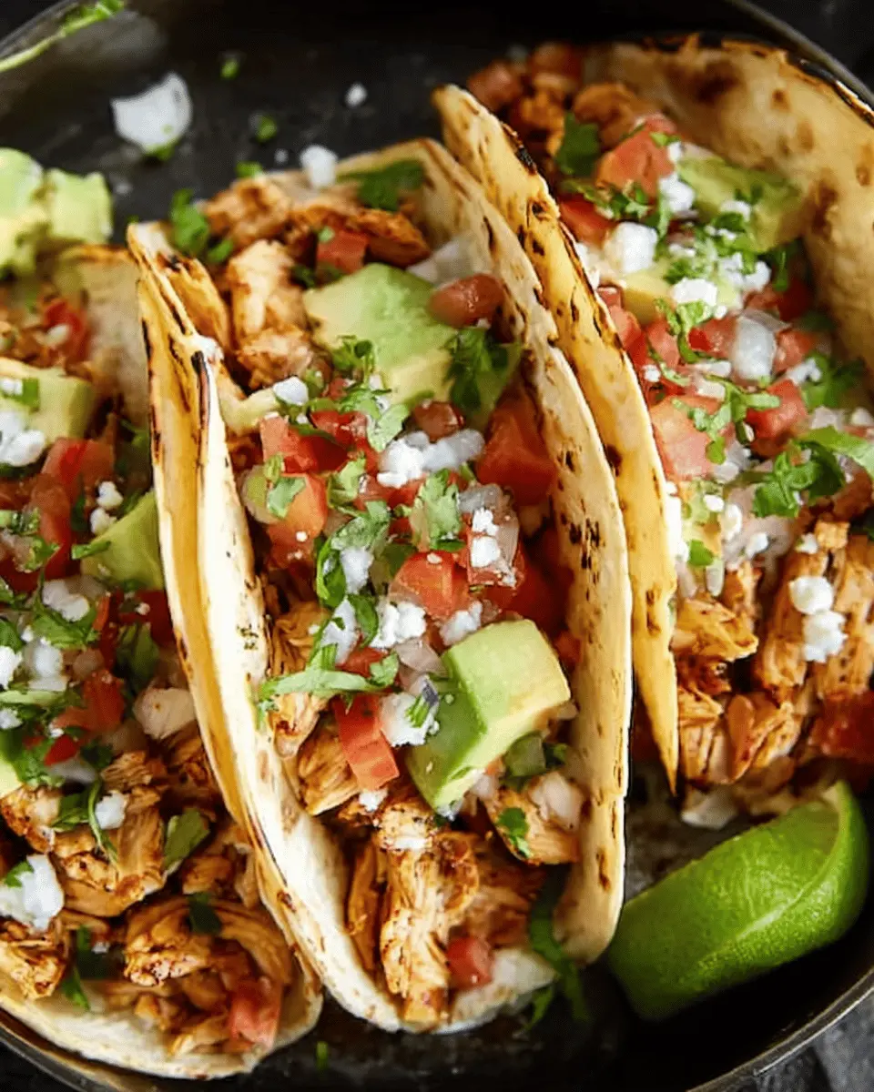 As the chicken rests, warm up your mini flour tortillas and get ready for assembly! Place a generous portion of the diced chicken into each tortilla. Top with a scoop of pico de gallo, diced avocado, and a sprinkle of fresh cilantro. The vibrant flavors and colors will make your easy chicken tacos both delicious and visually appealing!