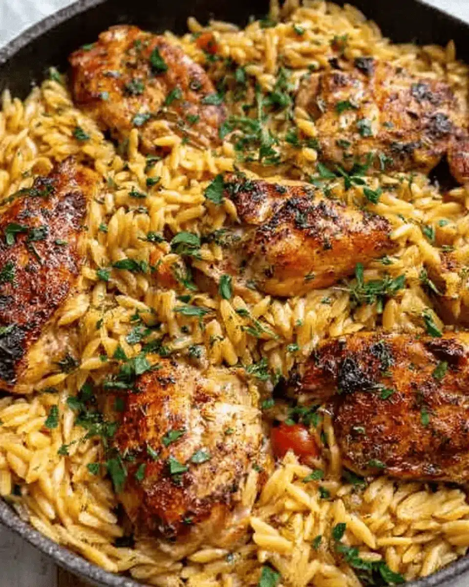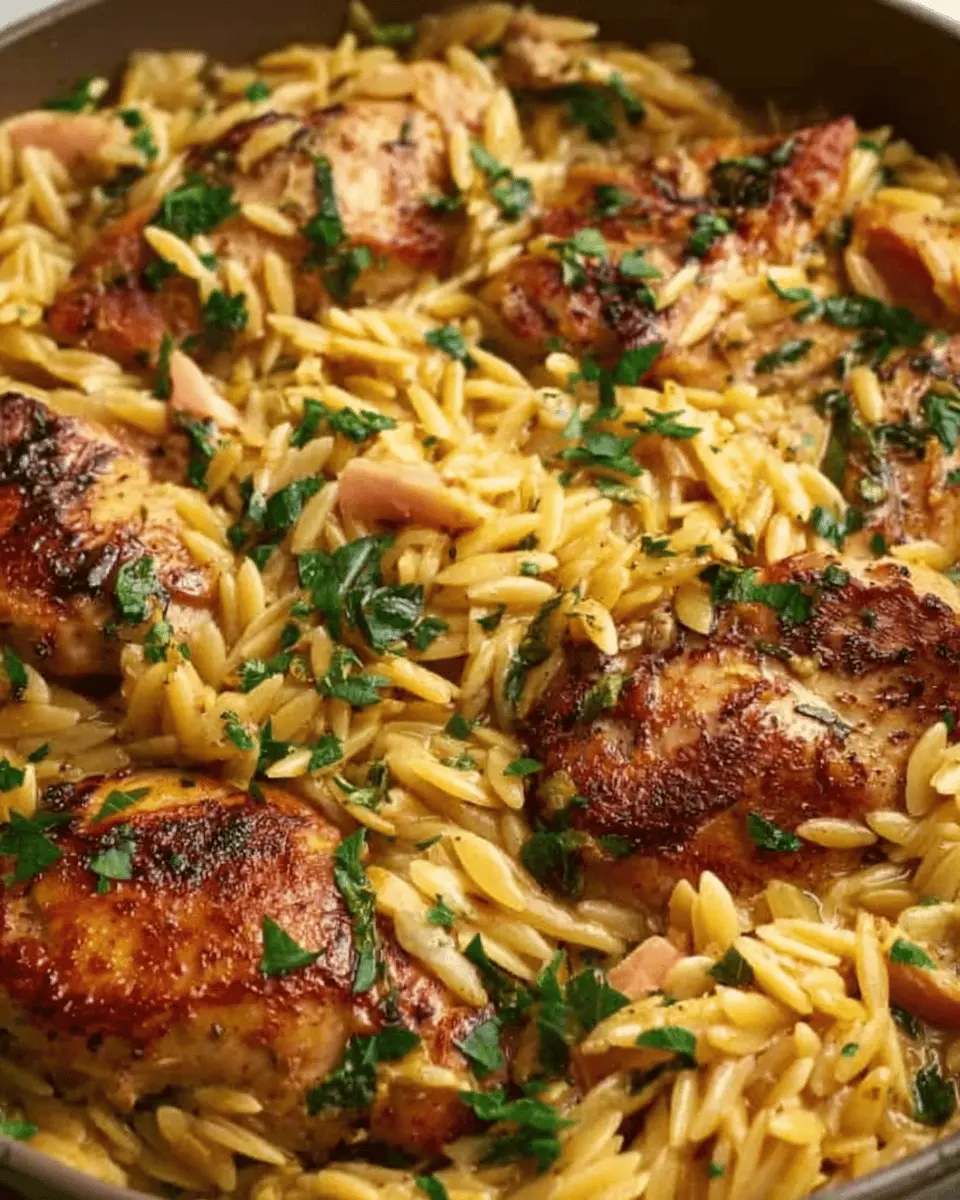 Want to mix things up? Try replacing chicken thighs with turkey bacon or chicken ham for a smokier flavor. Both options add a nice twist while keeping it light and delicious. Simply sauté the turkey bacon until crispy and then follow the recipe as stated. If you opt for chicken ham, it melds beautifully with the buttery orzo, creating a comfort dish that’s quick to prepare.
