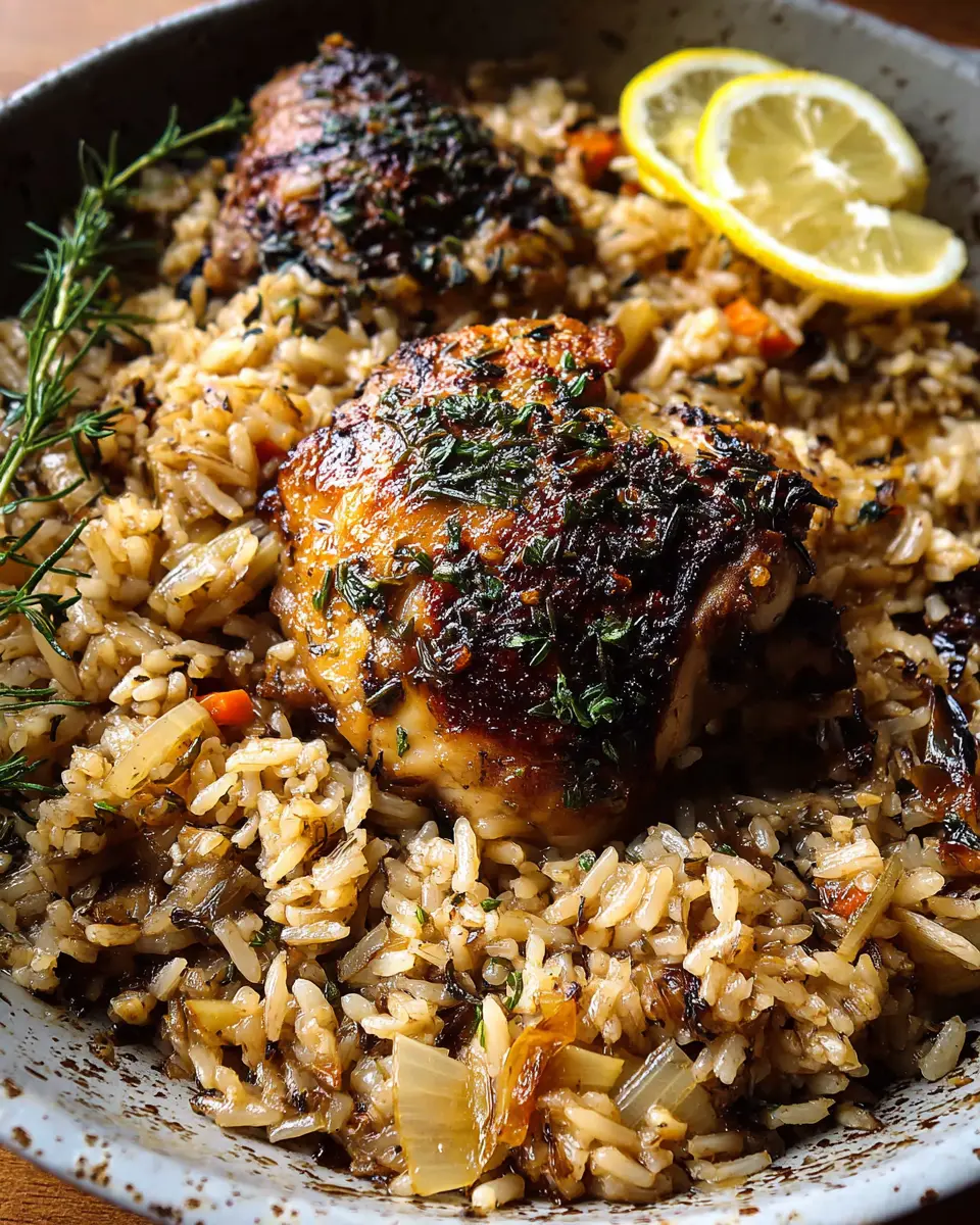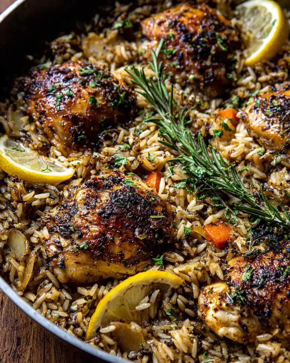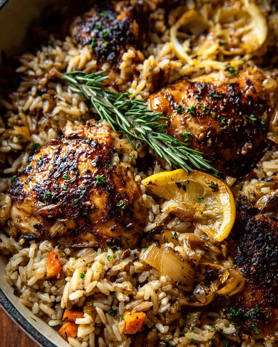 One Pot Lemon Rosemary Dijon Chicken and Butter Toasted Rice Pilaf