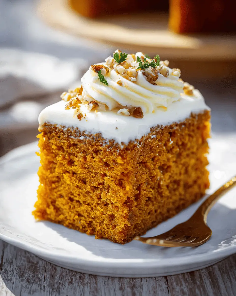 A slice of this delightful pumpkin cake contains about 414 calories, making it a satisfying dessert choice. With 48g of carbohydrates, 4g of protein, and 24g of fat, it offers a balance that fills you up while still being indulgent.