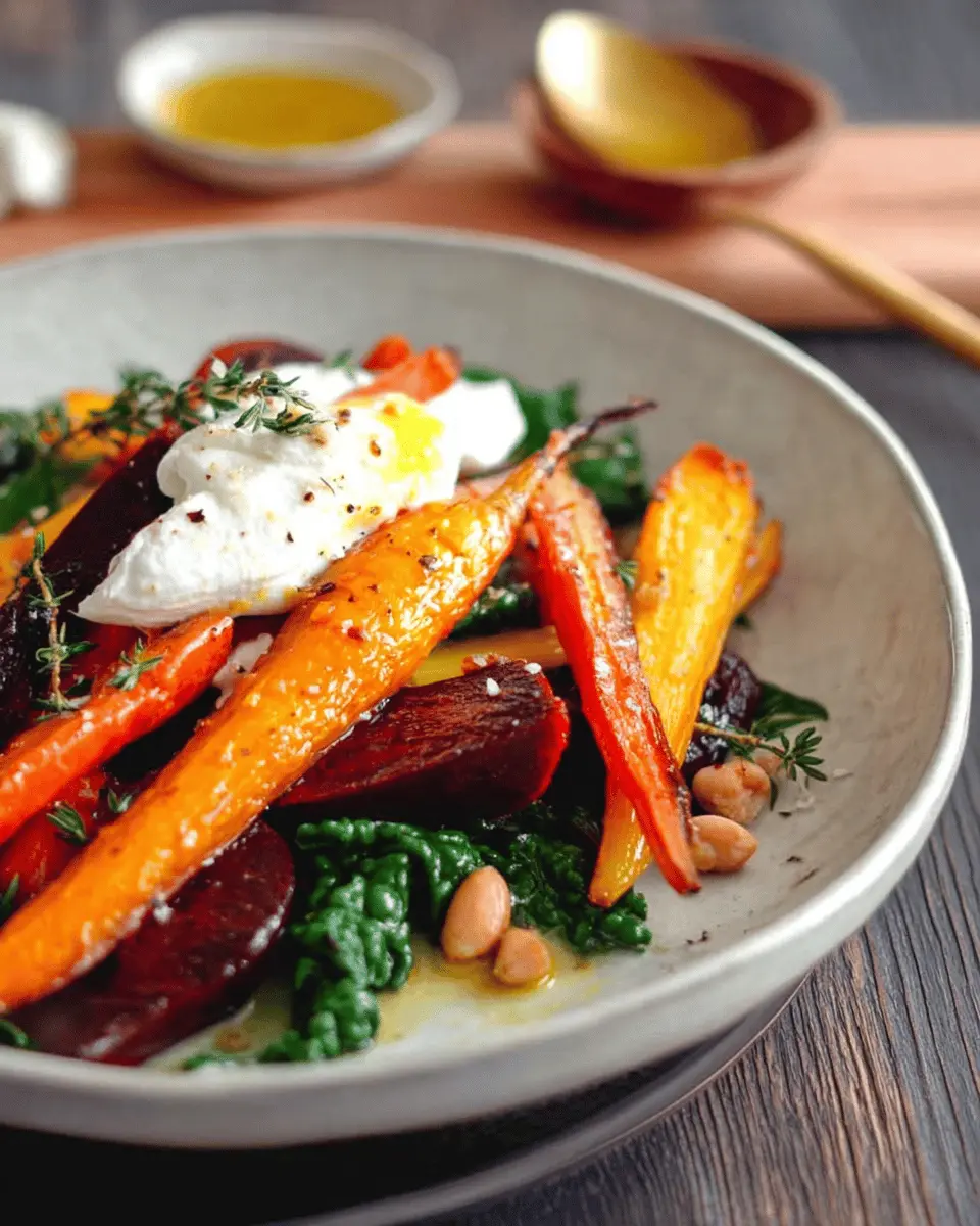Once everything is cooked, it’s time to assemble your salad. Start with a base of sautéed beet greens on a large serving platter. Top them with the roasted beets and carrots, then add creamy burrata for that luxurious touch. Drizzle your honey rosemary vinaigrette generously over the entire dish and garnish with fresh rosemary for an added pop of flavor and color.