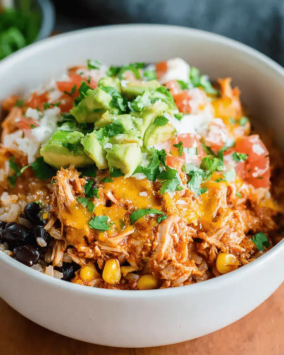 For a deliciously hearty vegetarian option, swap the chicken for a mix of beans like black, pinto, and chickpeas, and add in your favorite seasonal veggies. Zucchini, bell peppers, and sweet potatoes work beautifully as they cook down in the slow cooker, soaking up all those savory flavors. Don't forget to replace the chicken broth with vegetable broth to keep it plant-based! Top these bowls with creamy guacamole or a sprinkle of feta cheese for an extra zing.