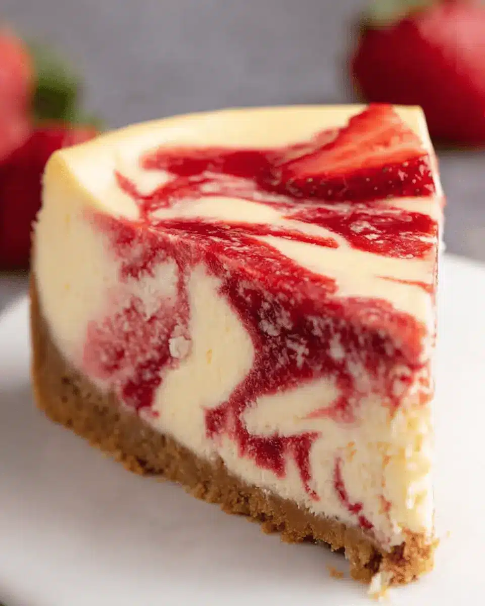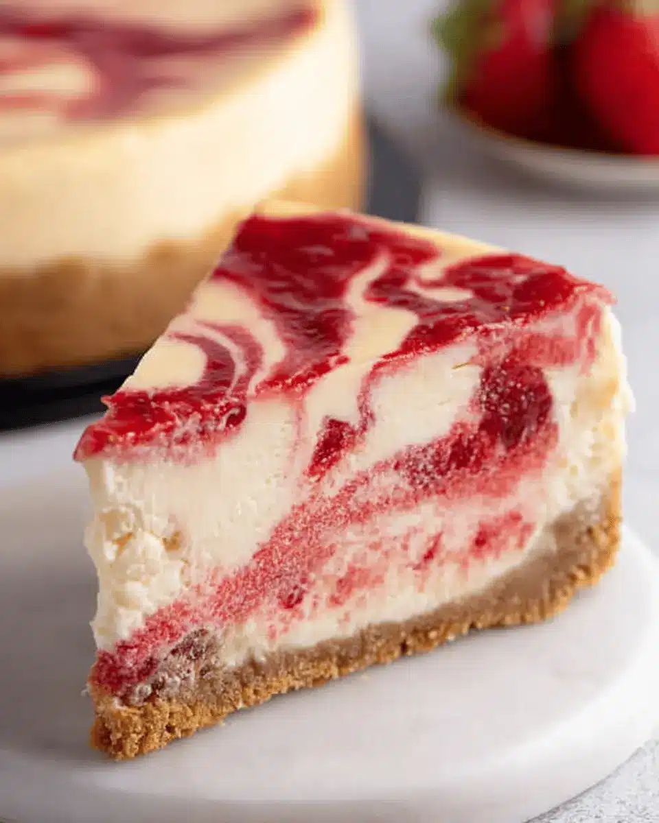 Leftover strawberry swirl cheesecake can be stored in an airtight container in the refrigerator for up to 5 days. If you want to keep it longer, consider freezing individual slices. Wrap each slice in plastic wrap followed by aluminum foil, and it can last up to three months in the freezer! For more storage tips, check out this guide, which covers everything you need to know for perfect cheesecake storage.