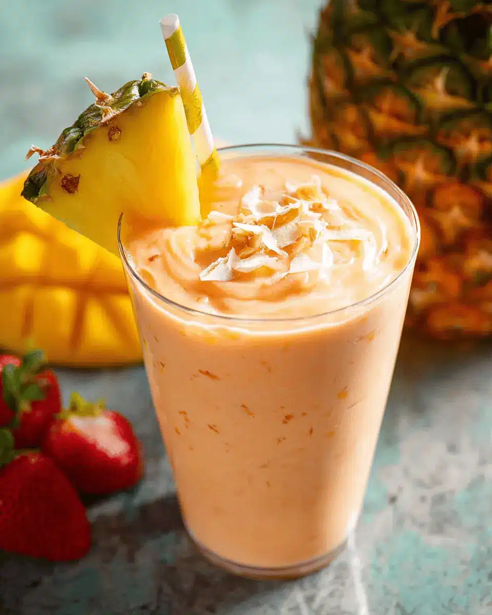 Your tropical smoothie masterpiece is ready to hit the scene! Pour it into your favorite glasses and consider adding decorative paper straws for that extra flair. Whether it’s a sunny afternoon on the patio or a cozy evening at home, enjoy this vibrant drink and treat yourself to a little piece of paradise.