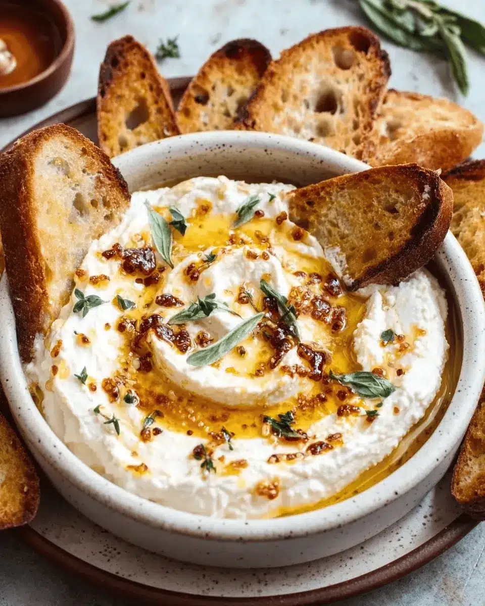 For an herbaceous take, mix in fresh herbs like basil, oregano, or even dill. Blend 1 tablespoon of your favorite herbs into the ricotta for a fresh, zesty flavor. You can even experiment with spices like garlic powder or smoked paprika to create a unique flavor profile. This herbed whipped ricotta dip with hot honey pairs perfectly with artisan bread or as a savory topping for roasted veggies. Explore your spice rack and let your creativity shine!